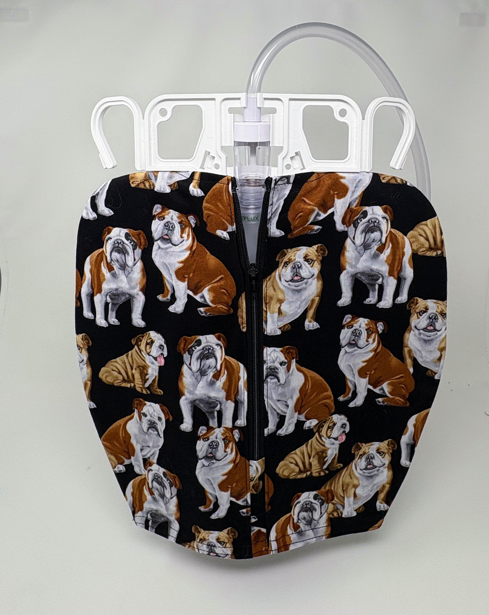 Double hanger style urine catheter drainage bag cover is designed to fit Bard and Medline 2000ml bags; (see photos of the bag styles this cover fits) It features a generous zippered front opening and open bottom for easy access to the drainage port. Hook apparatus stays fully usable with the cover on; no need to remove the cover to empty. The hem is also weighted a bit to help it hang straight and stay in place. Use the zipper to snug up the fit on the bag as well.