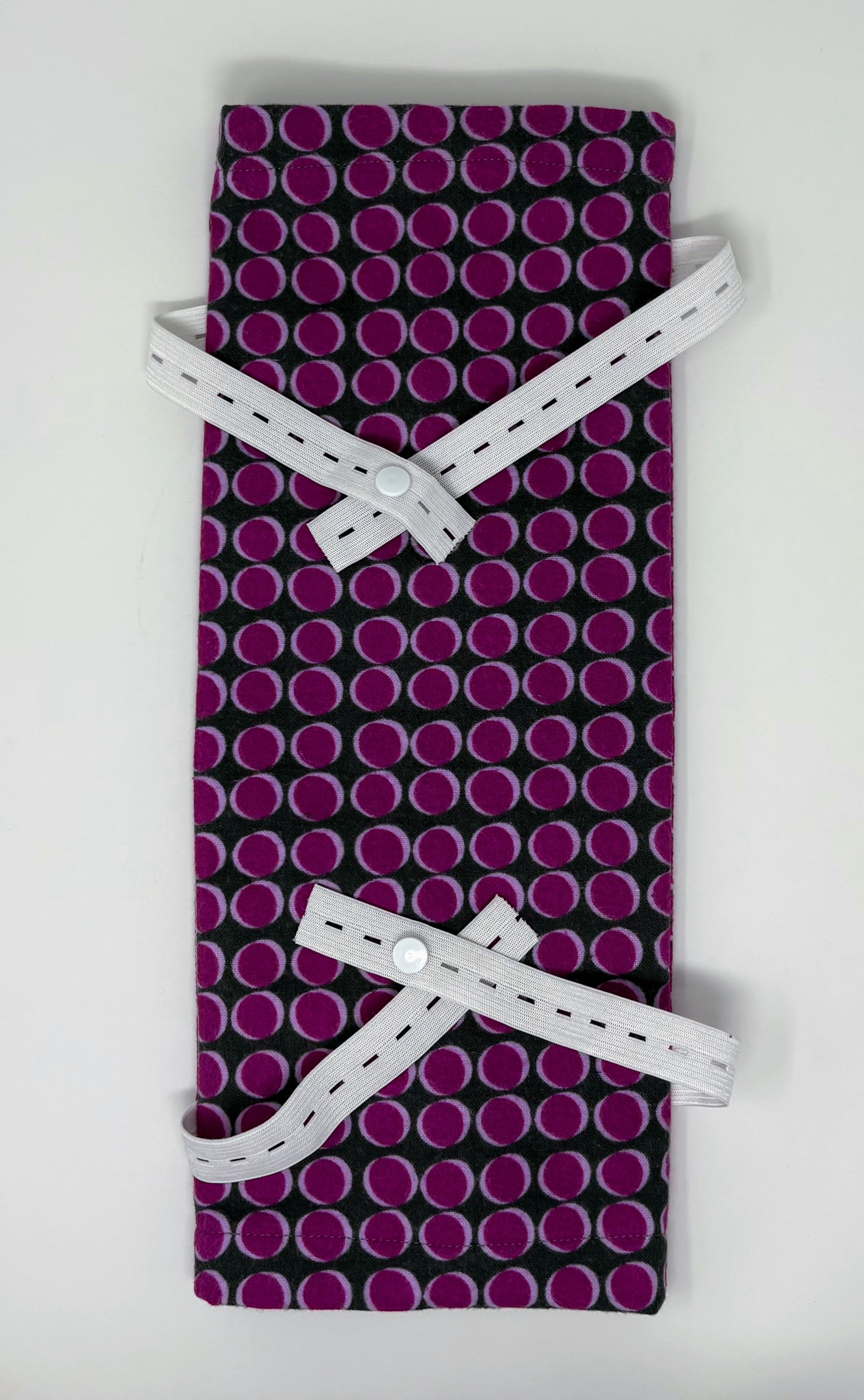 Leg bag cover in soft cotton flannel fits the 1000ml capacity collection bag pictured. Thread the elastic leg bag securing straps through the side slits for comforatable day wear. Full coverage of top and bottom ports eliminates the possibility of irritation to the skin from them.