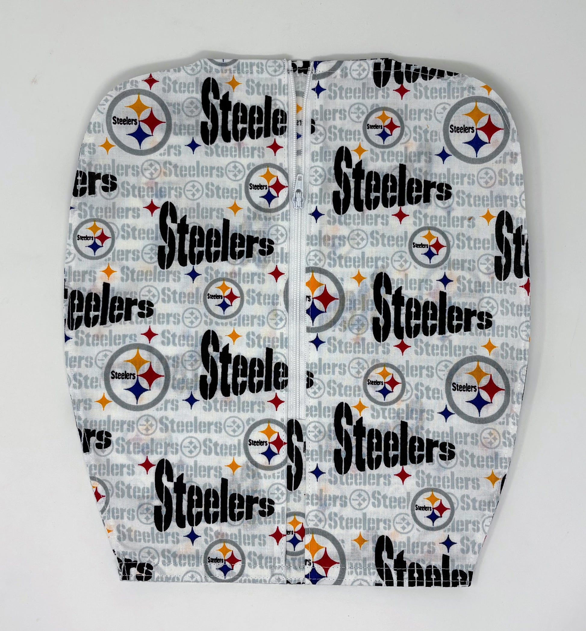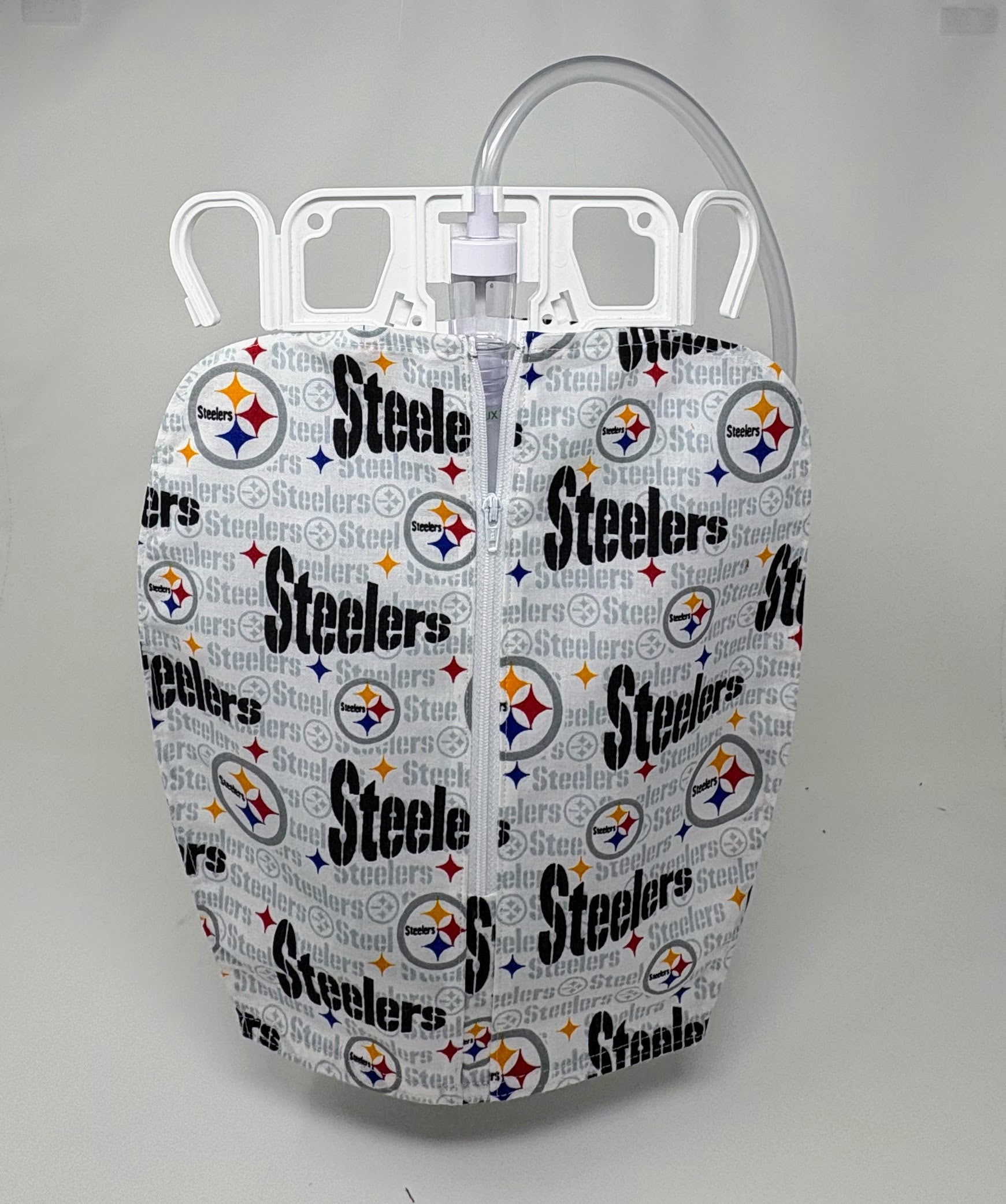 Zippered front urine bag cover with open bottom.