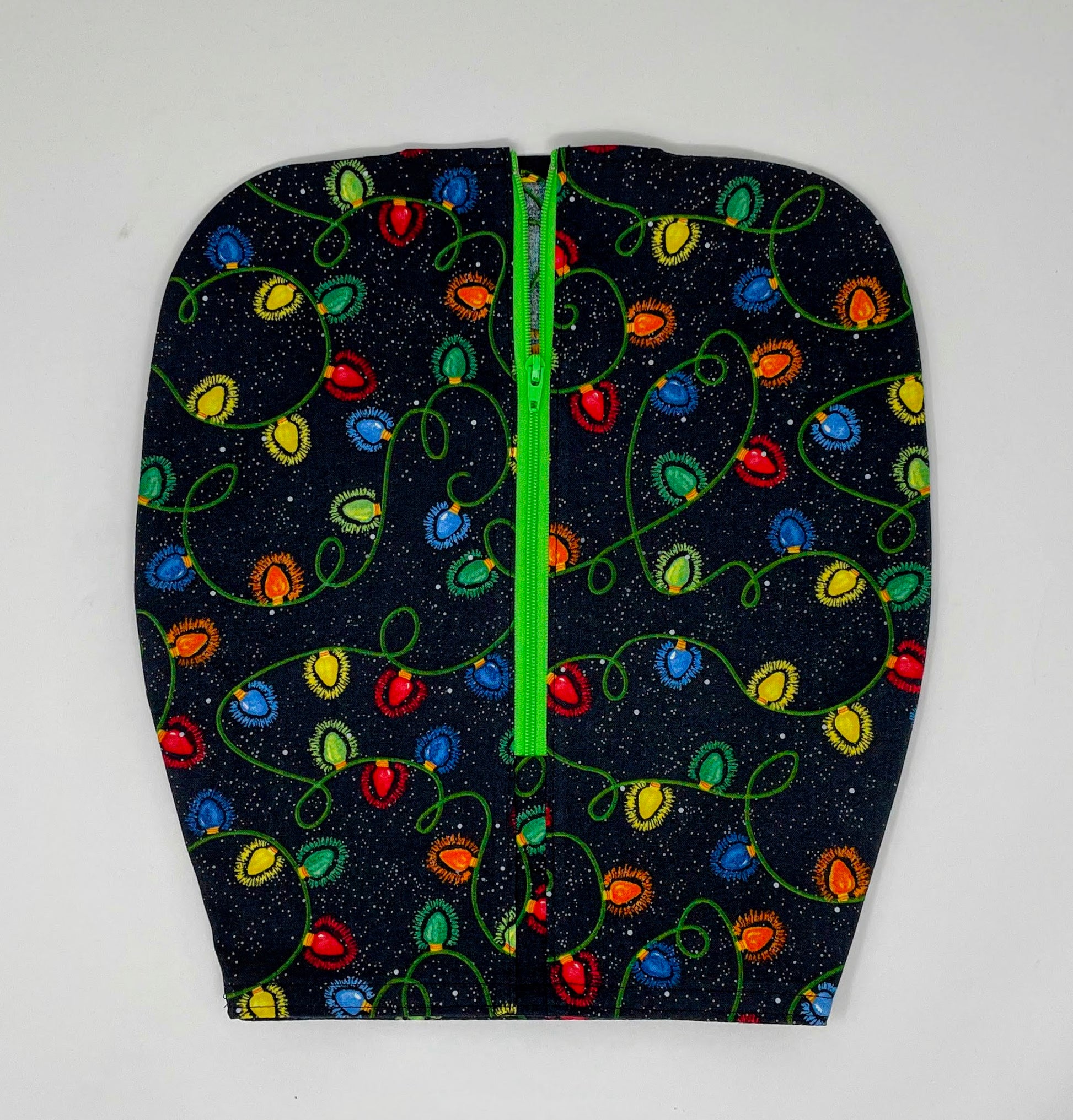 Use on double hook hanger bag styles (check out the pictures of bags the cover fits) Cotton print in holiday string lights on black background. Bright green zipper. Machine launder as you would your favorite shirt and hang to dry.