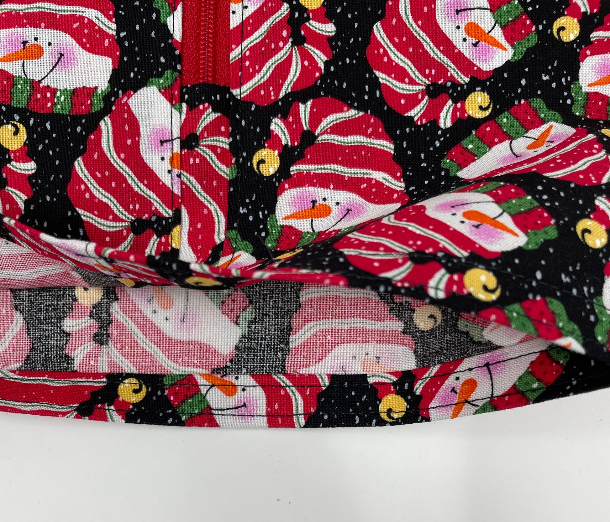 It measures 11.25 inches wide and 12.5 inches long, with a 8" bottom opening, and is made with 100% cotton. Jolly snow people in festive hats on black background. Coordinating red zipper.