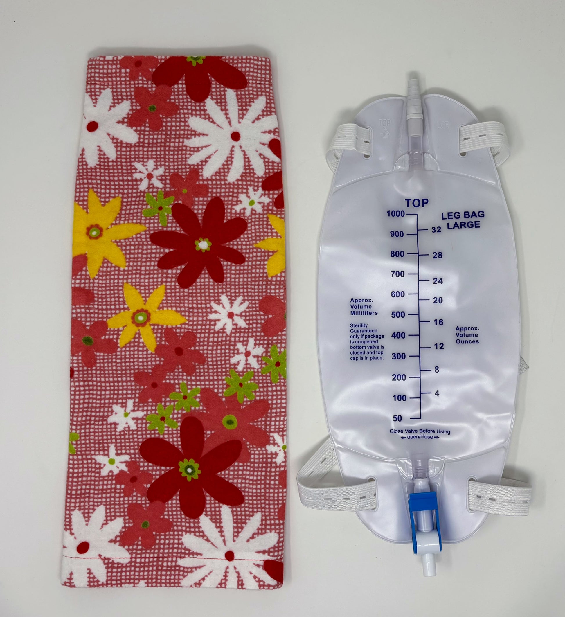 Cover fits 1000ml collection bag shown. 100% cotton, machine wash. Tapered top and open bottom hem gives easy access to drain port.