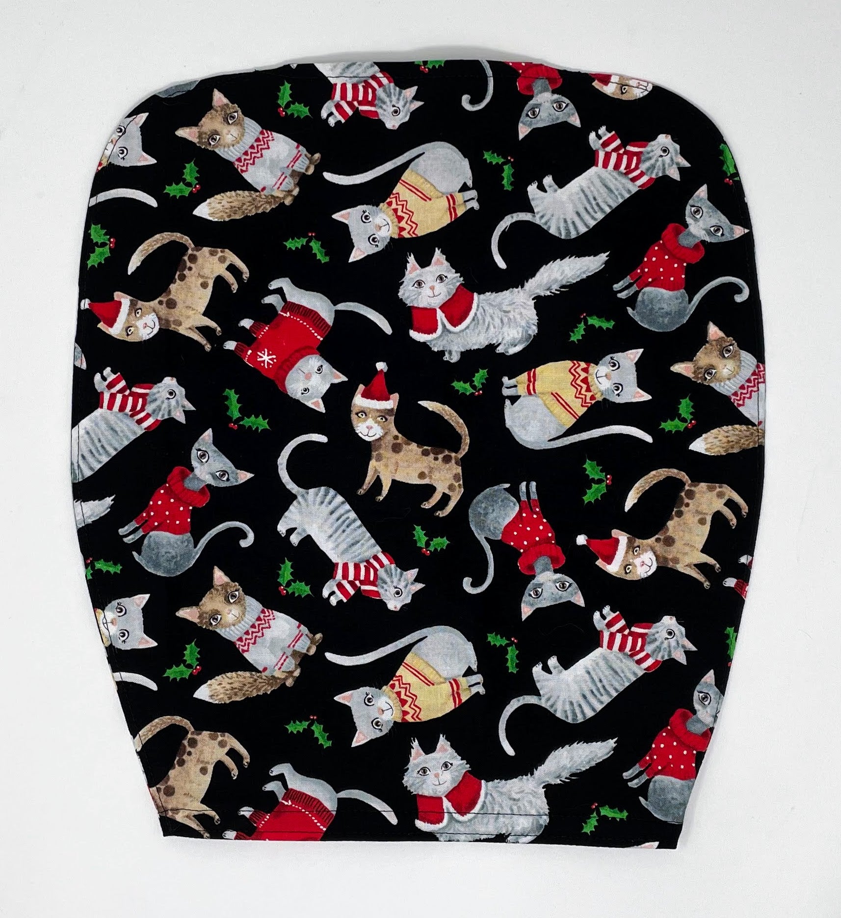 usable. Cats in holiday sweaters on black background cotton print. Red zipper.