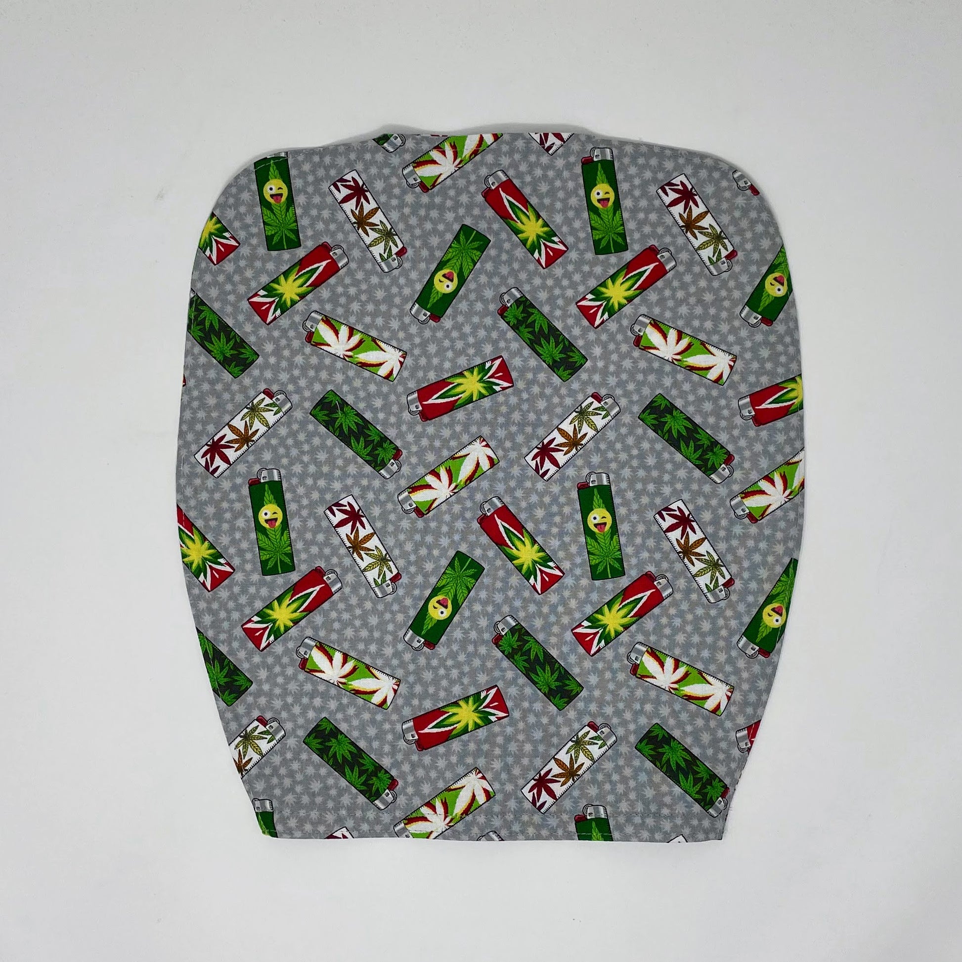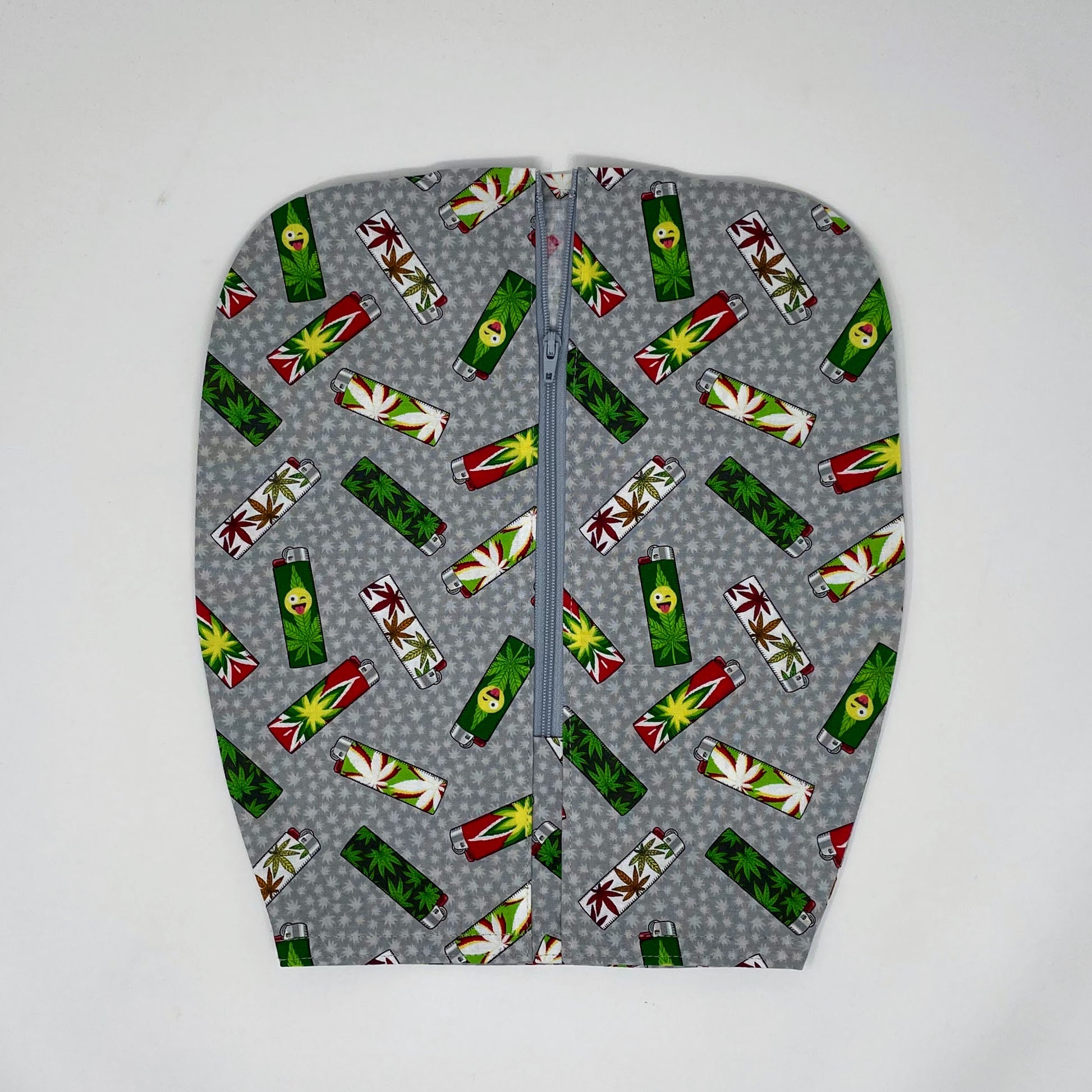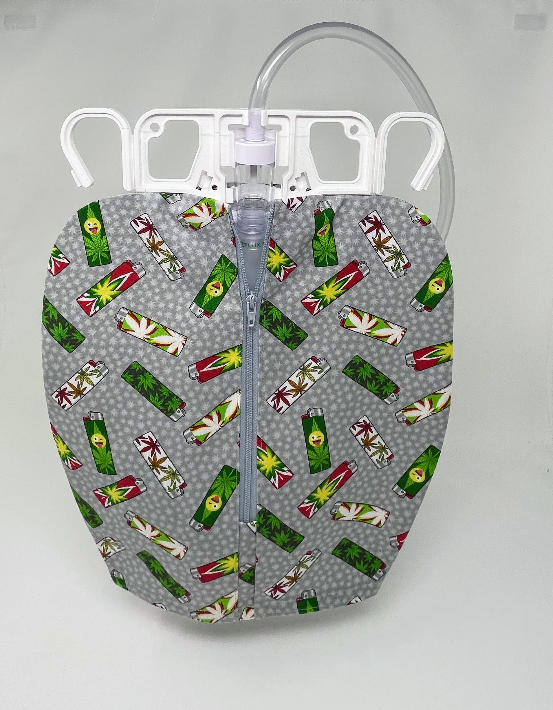 Zippered front urine bag cover with open bottom in Marijuana lighters cotton print.