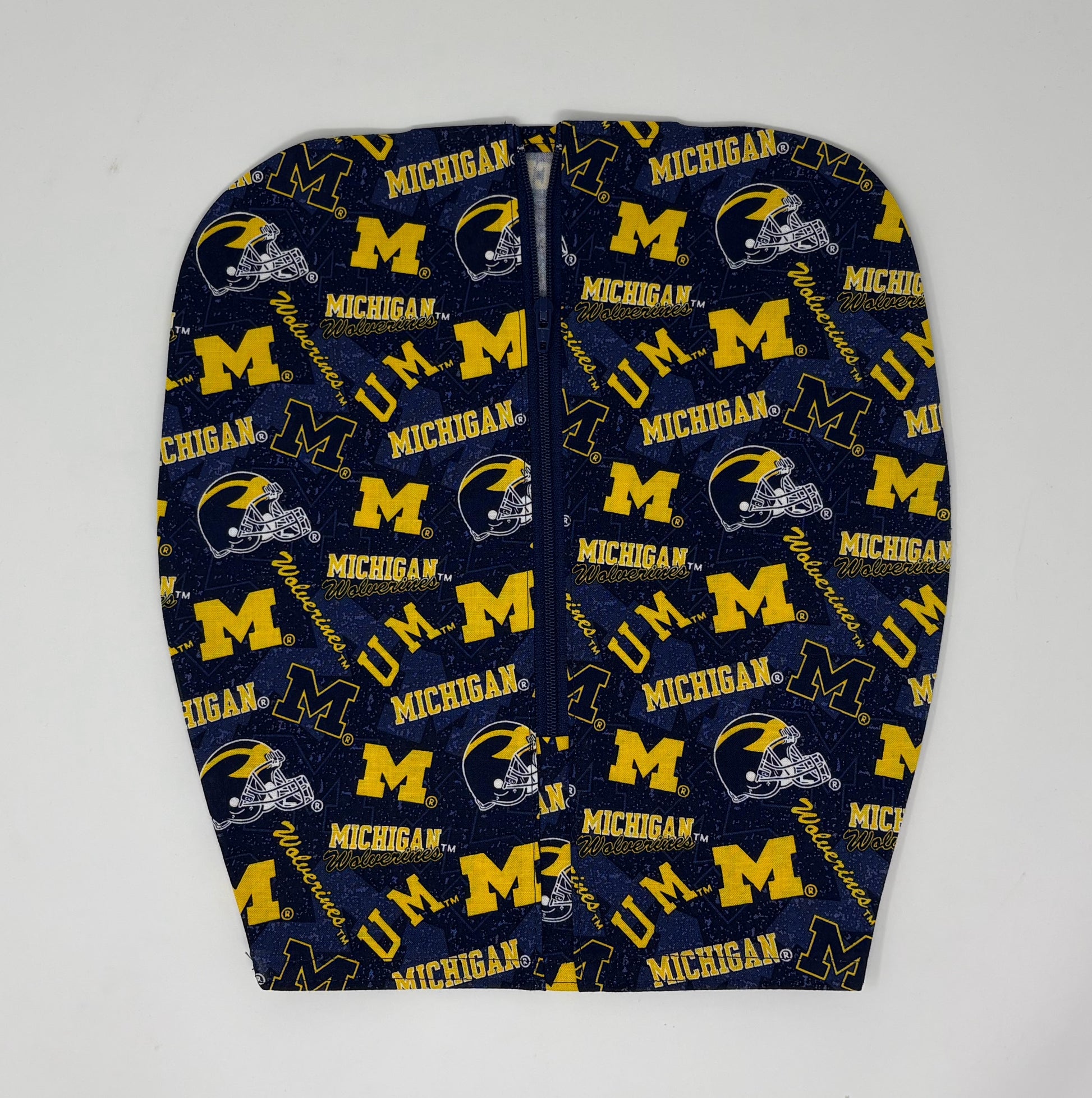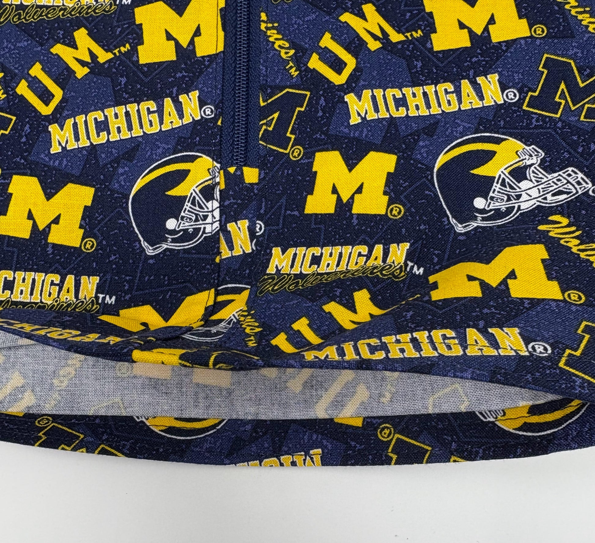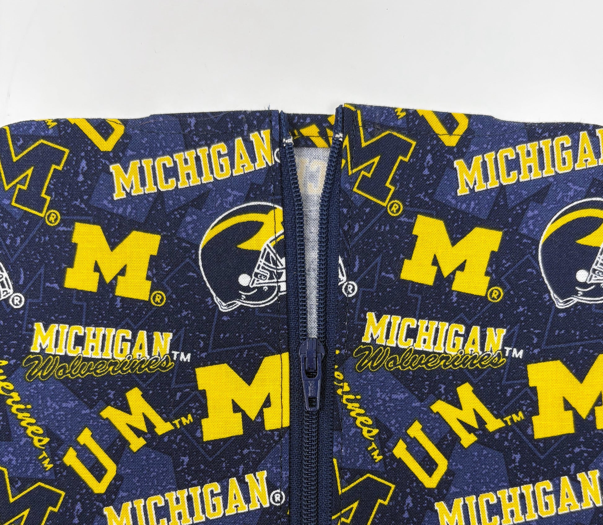 (1) Catheter bag cover in yellow and blue UM school colors. Open hem, easy on and off front zippered closure. All cotton body, nylon coil zipper in navy.