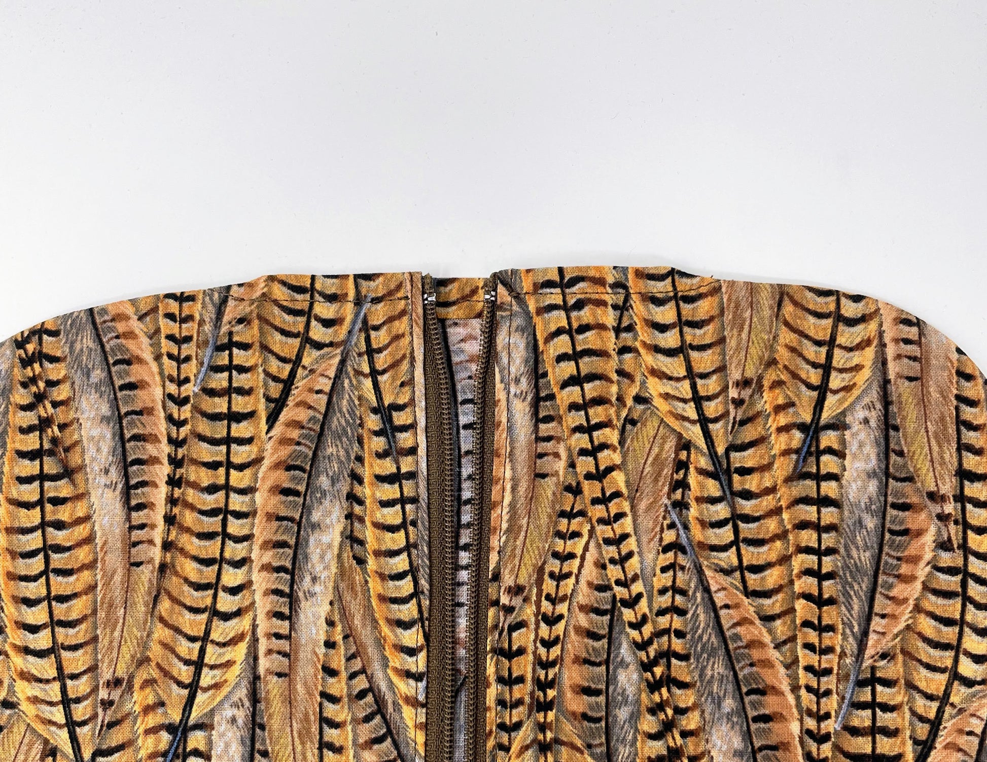 Zippered front urine bag cover with open bottom in Pheasant feathers cotton print.