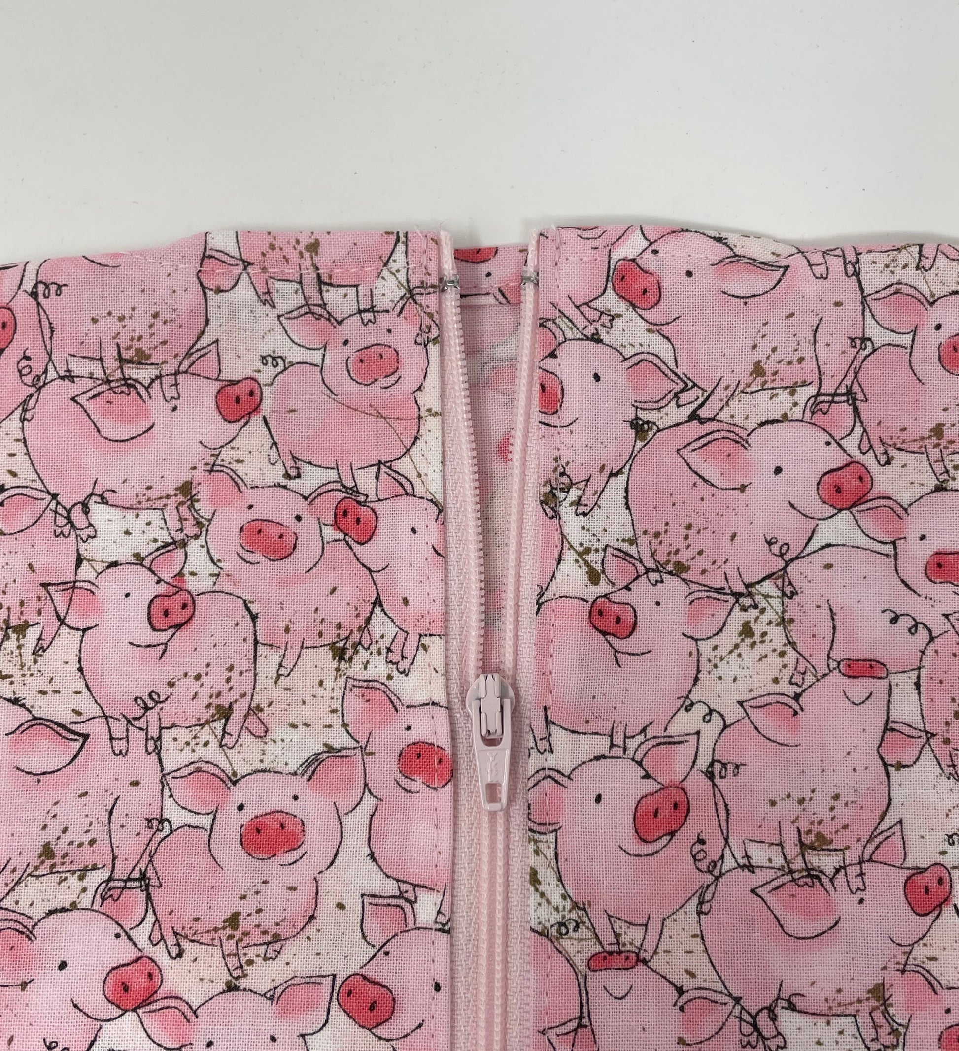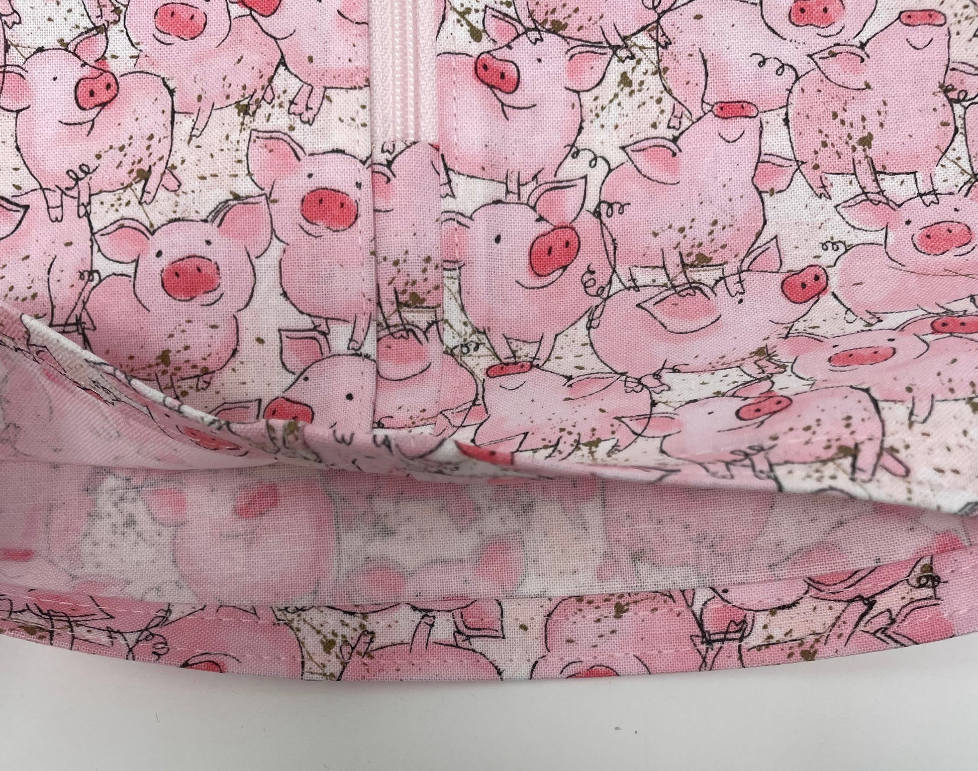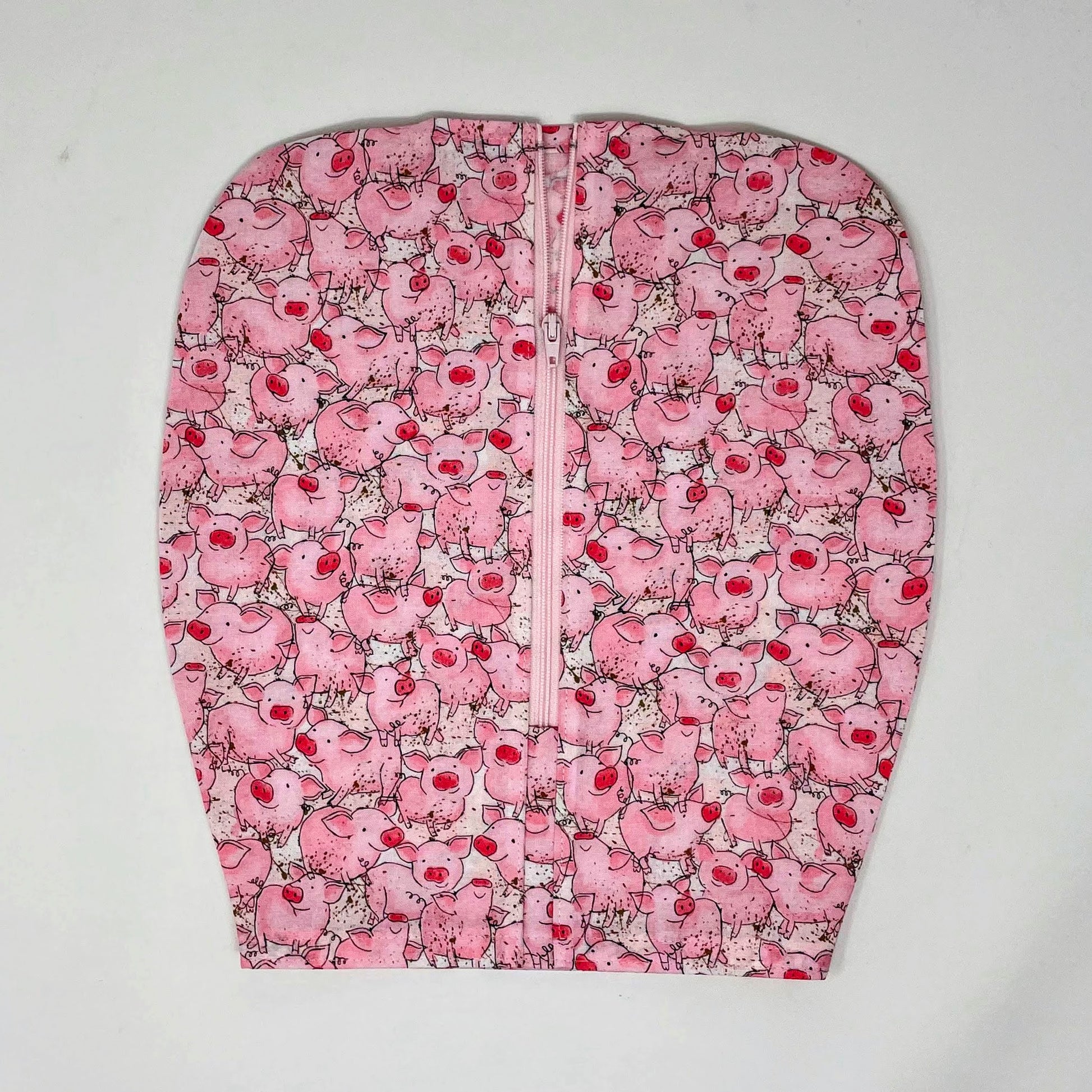Zippered front urine bag cover with open bottom in cotton print of cute pigs.