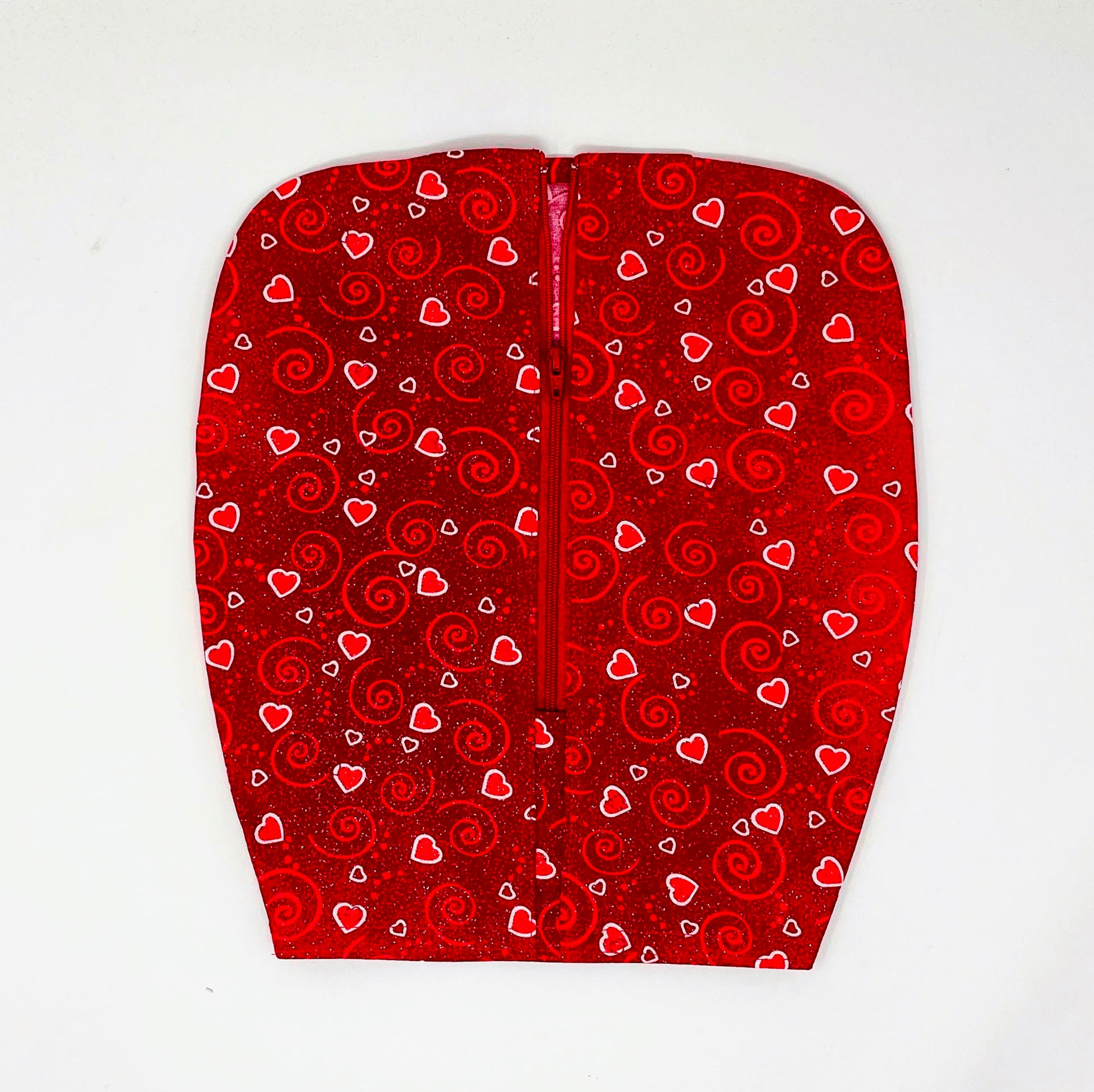 Zippered front urine bag cover with open bottom in Valentine heart cotton print.